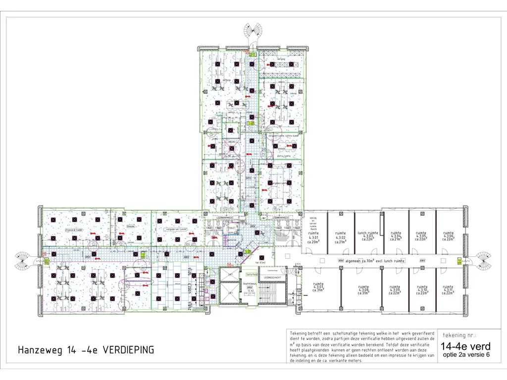 De totaal vloeroppervlakte van het gebouw bedraagt 5.656 m² verdeeld over 6 bouwlagen.